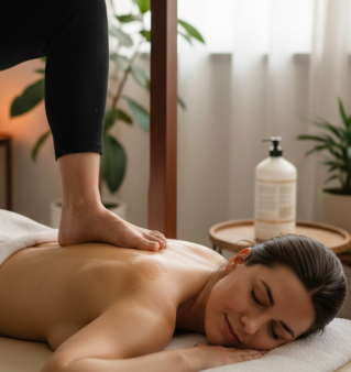 Ashiatsu is a unique deep-tissue massage where the therapist uses controlled barefoot pressure with overhead bars for balance and precision.